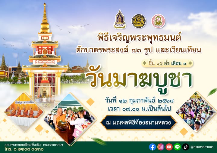 กรมการศาสนา ขอเชิญร่วมพิธีเจริญพระพุทธมนต์ ตักบาตร 73 รูป เนื่องในวันมาฆบูชา 2568