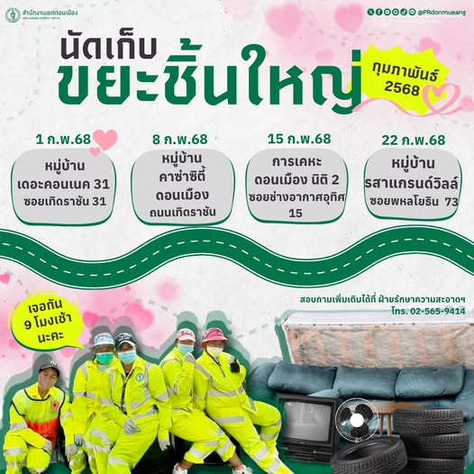 สำนักงานเขตดอนเมือง กำหนดการนัดเก็บขยะชิ้นใหญ่ ในพื้นที่เขตดอนเมือง เดือนกุมภาพันธ์ 2568