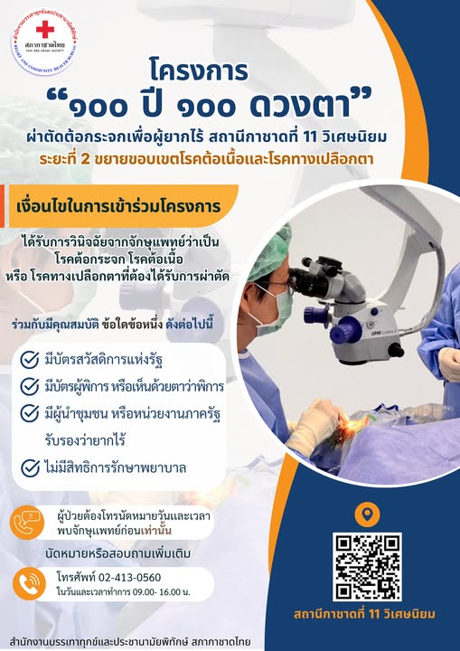 สภากาชาดไทย โดย สำนักงานบรรเทาทุกข์และประชานามัยพิทักษ์ เชิญร่วมโครงการ “100 ปี 100 ดวงตา” ผ่าตัดต้อกระจกเพื่อผู้ยากไร้ ระยะที่ 2 ขยายขอบเขตโรคต้อเนื้อและโรคทางเปลือกตา ณ สถานีกาชาดที่ 11 วิเศษนิยม บางแค