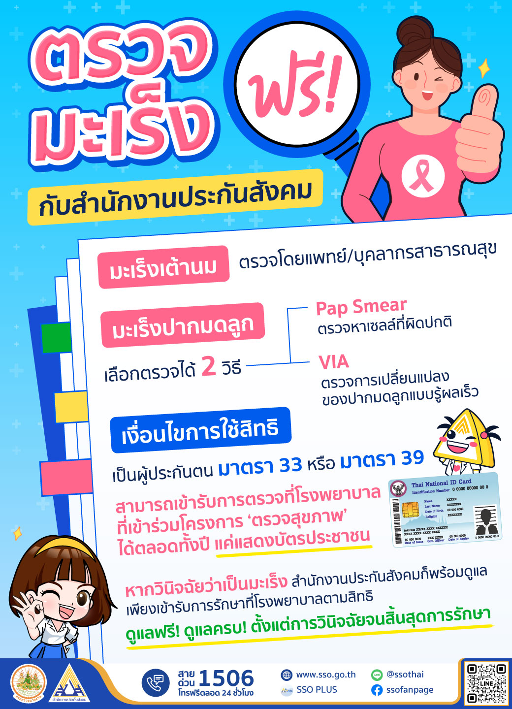สำนักงานประกันสังคม ให้สิทธิประโยชน์ตรวจคัดกรองมะเร็งฟรี โดยแบ่งการตรวจมะเร็งออกเป็น 2 แบบ คือ มะเร็งเต้านม และ มะเร็งปากมดลูก ผู้ประกันตนมาตรา 33 หรือมาตรา 39 สามารถเข้ารับการตรวจที่โรงพยาบาลที่เข้าร่วมโครงการ ‘ตรวจสุขภาพ’ ได้ตลอดทั้งปี แค่แสดงบัตรประชาชน หากวินิจฉัยว่าเป็นมะเร็ง สำนักงานประกันสังคมก็พร้อมดูแล เพียงเข้ารับการรักษาที่โรงพยาบาลตามสิทธิ ดูแลฟรี! ดูแลครบ! ตั้งแต่การวินิจฉัยจนสิ้นสุดการรักษา
