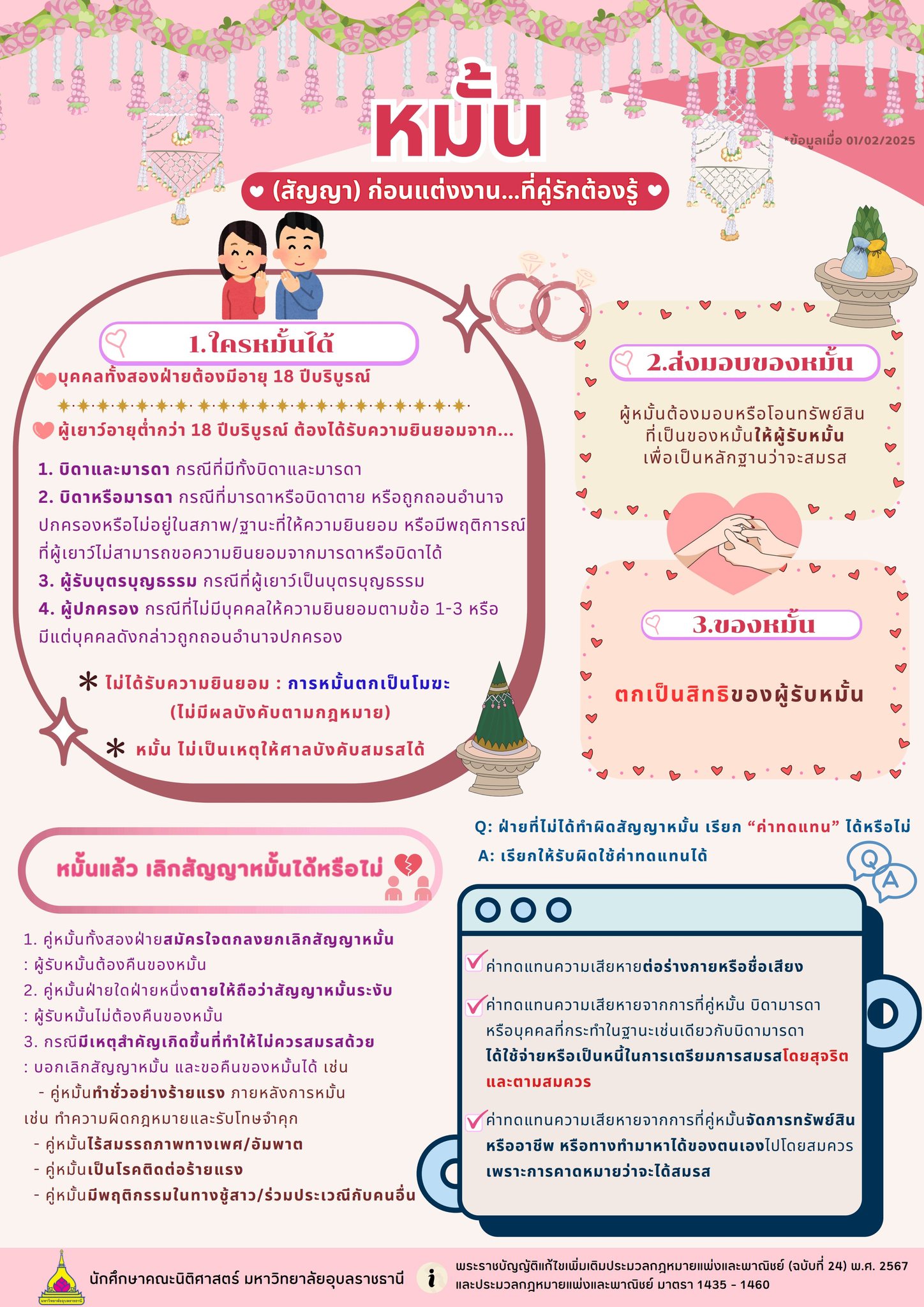 สำหรับวันนี้แอดมินขอนำเสนอผลงานของน้องนักศึกษาคณะนิติศาสตร์ ชั้นปีที่ 4 มหาวิทยาลัยอุบลราชธานี ในวิชาการศึกษากฎหมายเชิงคลินิก ซึ่งน้องๆ มีความสนใจและตั้งใจอยากสื่อสารความรู้กฎหมายในรูปแบบอินโฟกราฟิก เรื่อง การหมั้น (สัญญา) ก่อนแต่งงานที่คู่รักต้องรู้ตามกฎหมาย มีอะไรบ้างที่สำคัญก่อนเข้าสู่พิธีหมั้น: ฝากกด Like กด Share เป็นกำลังใจให้น้องๆ ด้วยนะครับ