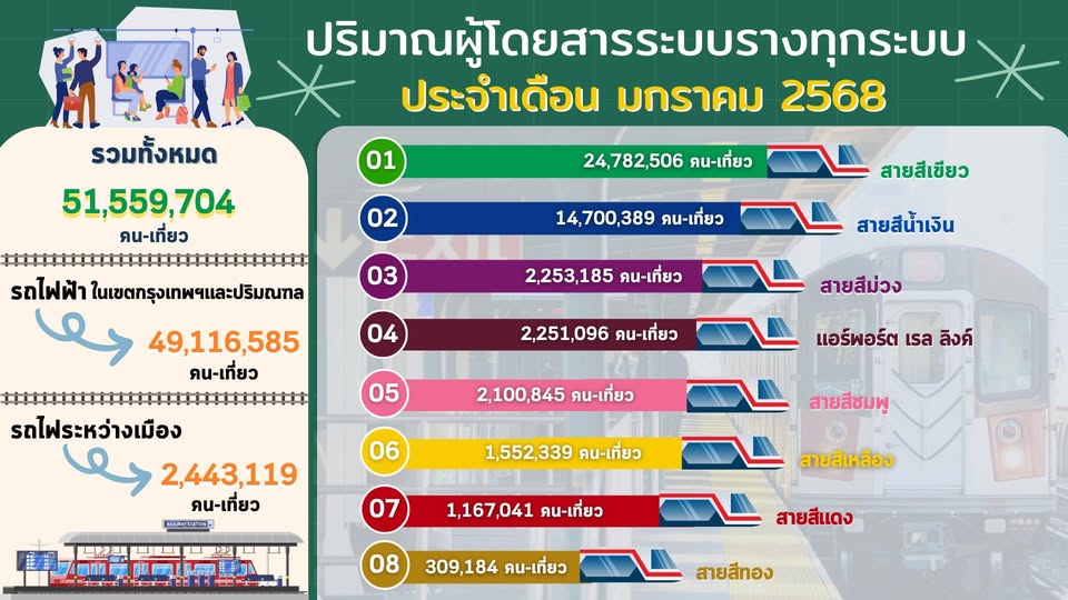 กรมการขนส่งทางราง เปิดเผยปริมาณผู้ใช้บริการระบบขนส่งทางราง ประจำเดือนมกราคม 2568 ผู้ใช้บริการทั้งหมด 51,559,704 คน-เที่ยว