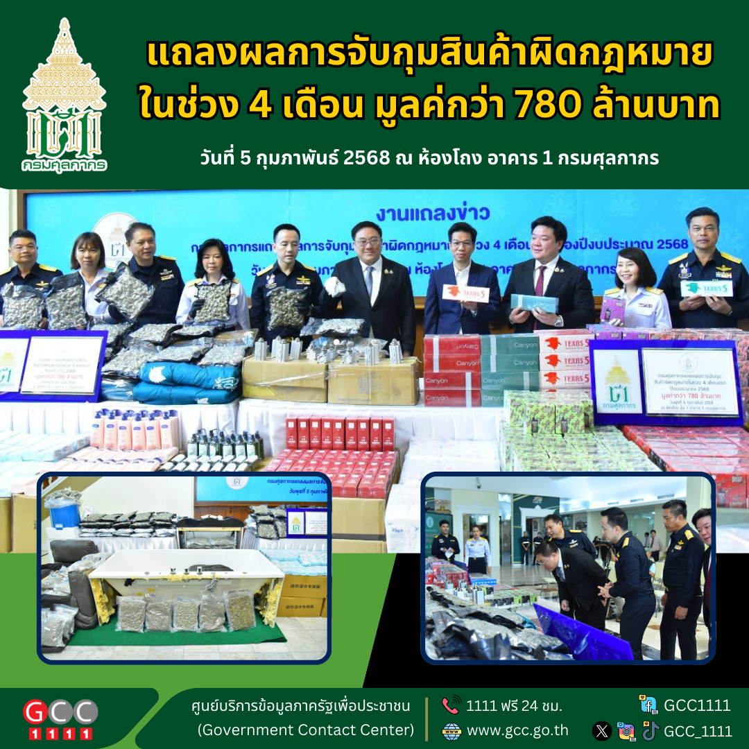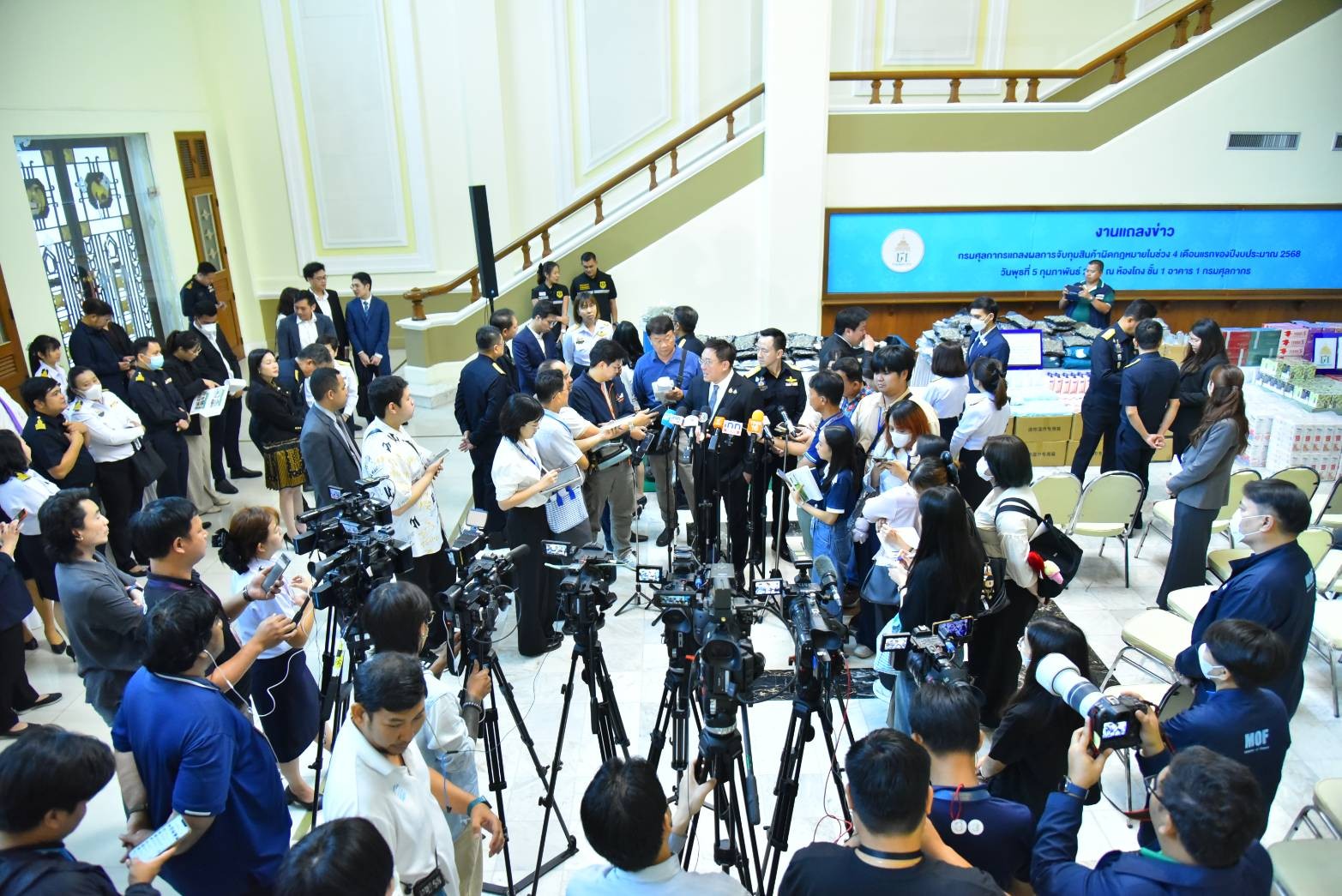 กรมศุลกากร ออกแถลงผลการจับกุมสินค้าผิดกฎหมายในช่วง 4 เดือนแรกของปีงบประมาณ 2568 มูลค่ากว่า 780 ล้านบาท วันที่ 5 กุมภาพันธ์ 2568 เวลา 10.00 น. ณ ห้องโถง อาคาร 1 กรมศุลกากร