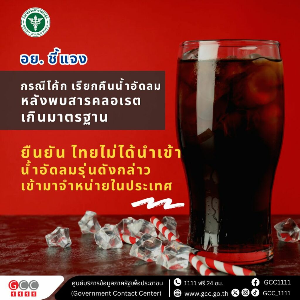 สำนักงานคณะกรรมการอาหารและยา ได้ชี้แจงกรณีที่โคคา-โคลาเรียกคืนน้ำอัดลมในยุโรปหลังพบสารคลอเรตเกินมาตรฐาน โดยยืนยันว่าไม่มีการนำเข้าผลิตภัณฑ์ที่มีปัญหาจากเบลเยียมมาจำหน่ายในประเทศไทย และผลิตภัณฑ์น้ำอัดลมที่ได้รับอนุญาตในไทยส่วนใหญ่มาจากประเทศในกลุ่มอาเซียน ซึ่งไม่พบปัญหาสารคลอเรตที่ถูกเรียกคืนในยุโรป  ยืนยันว่าได้มีการตรวจสอบและเฝ้าระวังความปลอดภัยของผลิตภัณฑ์อาหารและเครื่องดื่มอย่างเข้มงวด ขอให้ประชาชนมั่นใจในมาตรฐานความปลอดภัยของผลิตภัณฑ์ที่จำหน่ายในประเทศไทย