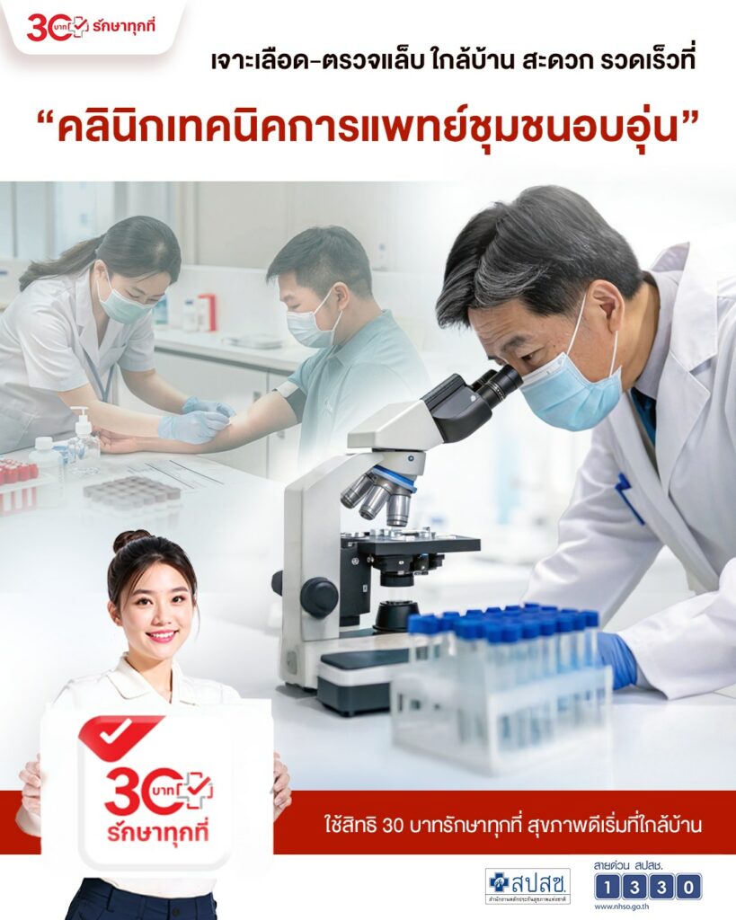 สำนักงานหลักประกันสุขภาพแห่งชาติ (สปสช.) ขยายสิทธิประโยชน์โครงการ “30 บาทรักษาทุกที่” ให้ประชาชนสามารถเข้ารับบริการเจาะเลือดและตรวจแล็บตามใบสั่งแพทย์ได้ที่ “คลินิกเทคนิคการแพทย์ชุมชนอบอุ่น” เพื่ออำนวยความสะดวก ลดความแออัดในโรงพยาบาล และเพิ่มการเข้าถึงบริการทางการแพทย์ ครอบคลุม 24 รายการ