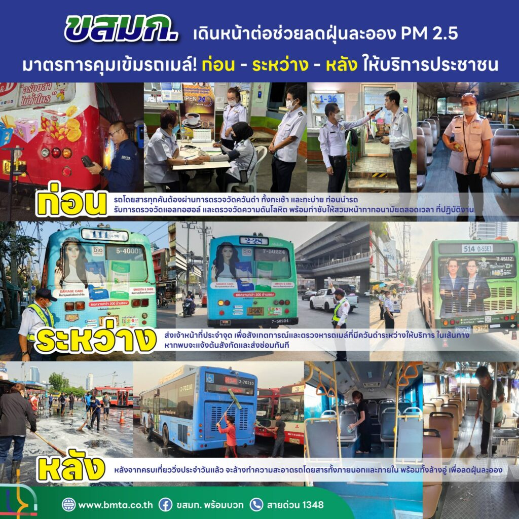 นายกิตติกานต์ จอมดวง จารุวรพลกุล ผู้อำนวยการองค์การขนส่งมวลชนกรุงเทพ กล่าวว่า องค์การขนส่งมวลชนกรุงเทพ (ขสมก.) ได้วางกรอบแนวทางการปฏิบัติงานตามมาตรการป้องกันและแก้ไขปัญหามลภาวะ และที่สำคัญคือความตั้งใจในการเป็นส่วนหนึ่งที่จะช่วยลดฝุ่นละอองจากยานพาหนะ โดยได้ กำหนดเพิ่ม และคุมเข้มมาตรการต่างๆ ทั้ง ก่อนออกให้บริการ ระหว่างเส้นทาง และหลังการให้บริการ ดังนี้