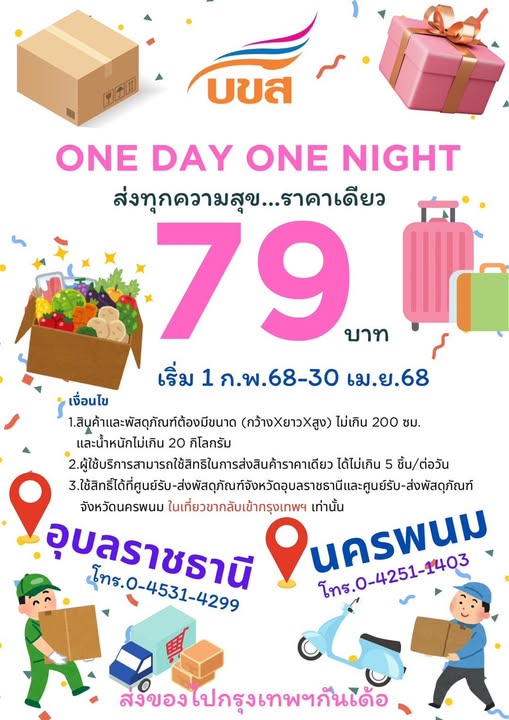 บริษัท ขนส่ง จำกัด จัดโปรโมชั่น One day One night ส่งทุกความสุข…ราคาเดียว 79 บาท สำหรับชาวอุบลฯ – นครพนม ส่งของเข้ากรุงเทพ ฯ ตั้งแต่บัดนี้ – 30 เมษายน 2568