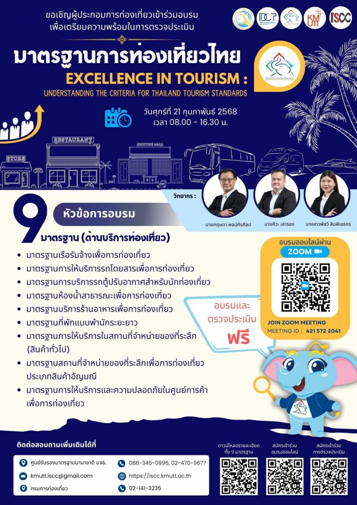 กรมการท่องเที่ยว ขอเชิญสถานประกอบการด้านการท่องเที่ยว เข้าร่วมการอบรมเพื่อเตรียมความพร้อมเข้าสู่การตรวจประเมินมาตรฐานการท่องเที่ยวไทย ประจำปี 2568