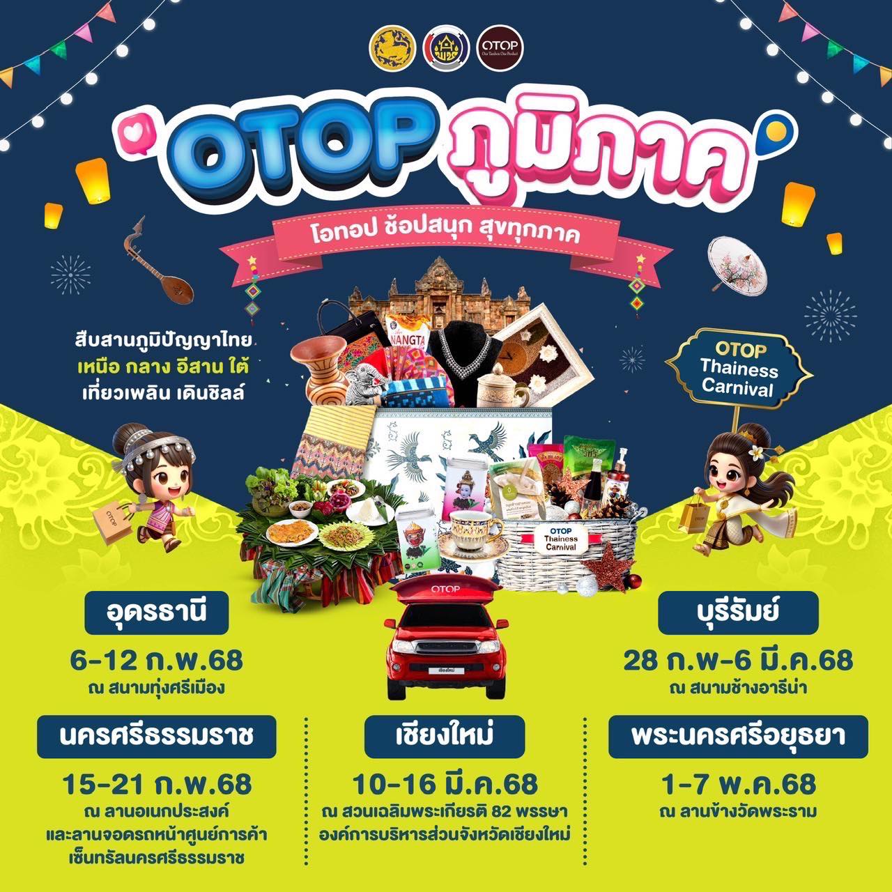กรมการพัฒนาชุมชน จัดงาน “OTOP ภูมิภาค 2568” พบกับผลิตภัณฑ์ OTOP ทั้ง 5 ประเภท และ OTOP ชวนชิมที่มีชื่อเสียงของแต่ละจังหวัด อีกทั้งยังมีการสาธิตและจัดแสดงกระบวนการพัฒนาภูมิปัญญาท้องถิ่น ที่มีความโดดเด่น เพื่อเพิ่มเสน่ห์ ดึงดูดความสนใจ ให้กับผลิตภัณฑ์ OTOP