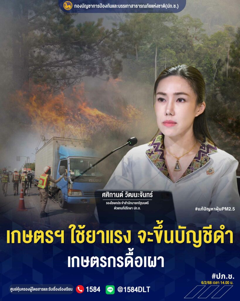 วันนี้ (6 กุมภาพันธ์ 2568) น.ส.ศศิกานต์ วัฒนะจันทร์ รองโฆษกประจำสำนักนายกรัฐมนตรี เปิดเผยว่า วันนี้ กองบัญชาการป้องกันและบรรเทาสาธารณภัยแห่งชาติ (ปภ.ช.) เปิดเผยว่า ที่ประชุมได้ติดตามสถานการณ์ฝุ่นควันอย่างต่อเนื่อง โดยเฉพาะการคุมเข้มสั่งห้ามเผา และการตรวจจับดำเนินคดีอย่างเด็ดขาด ซึ่งกระทรวงเกษตรและสหกรณ์ ได้รายงานแนวทางและขั้นตอนการแจ้งเตือนและป้องปรามเกษตรกรไม่ให้เผา ควบคู่กับการส่งเสริมวิธีการกำจัดเศษวัสดุทางการเกษตร เช่น ไถกลบตอซัง ใช้จุลินทรีย์และอินทรียวัตถุ โดยในเบื้องต้นได้รับความร่วมมือจากเกษตรกร และเตรียมขึ้นบัญชีเกษตรกรที่ถูกตัดสิทธิ์และไม่ปฏิบัติตามข้อสั่งการของรัฐ ซึ่งจะประกาศในเร็วๆนี้