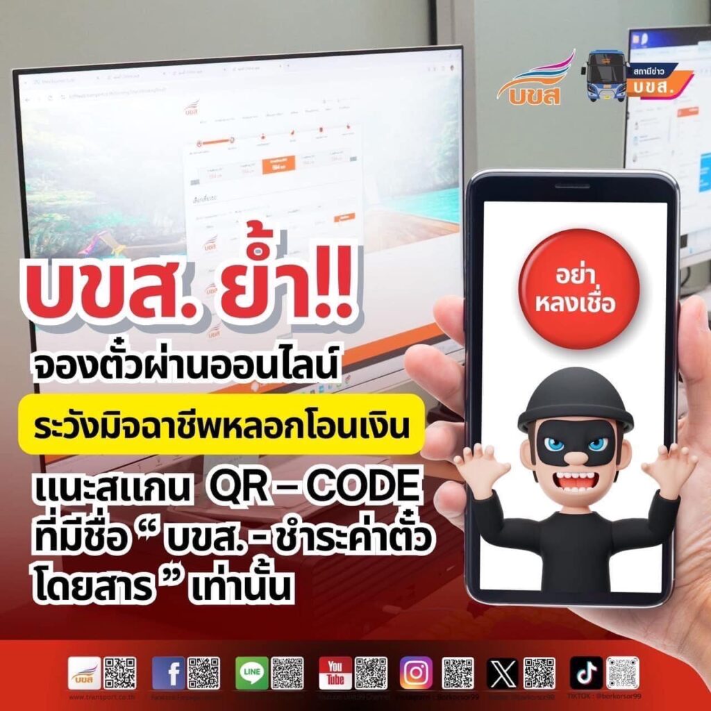 บขส. เตือนประชาชนระวังมิจฉาชีพหลอกโอนเงินจองตั๋วออนไลน์ เสี่ยงเสียทรัพย์สิน