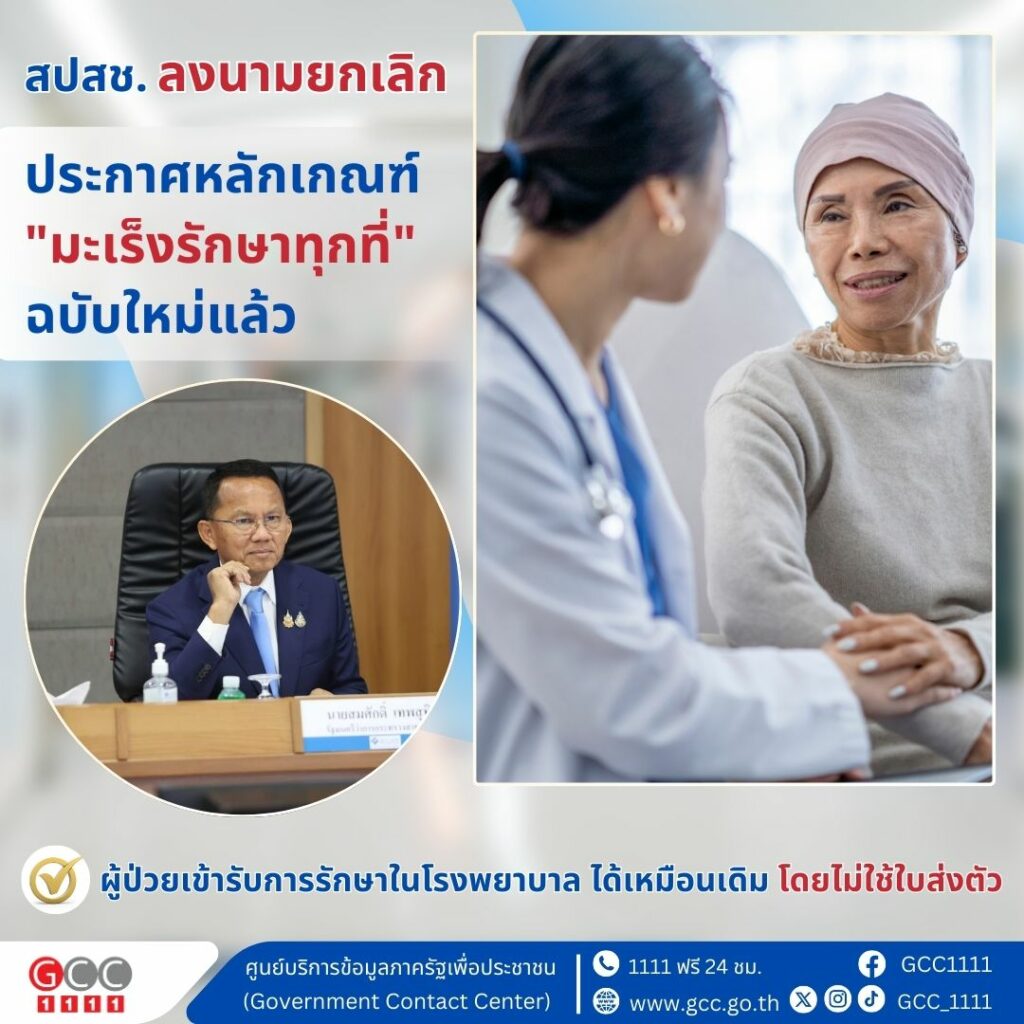 สปสช. ลงนามยกเลิกประกาศหลักเกณฑ์ “มะเร็งรักษาทุกที่” ฉบับใหม่แล้ว ผู้ป่วยเข้ารับการรักษาใน รพ. ได้เหมือนเดิมโดยไม่ใช้ใบส่งตัว