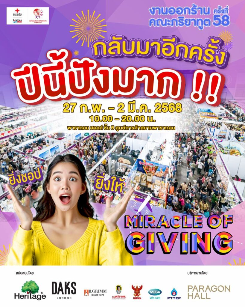 สภากาชาดไทย ร่วมกับคณะภริยาทูตประจำประเทศไทย เชิญเที่ยวงานงานออกร้านคณะภริยาทูต ครั้งที่ 58 หรือมหกรรมสินค้านานาชาติ เพื่อการกุศลแห่งปี ในธีม “Miracle of Giving” มหัศจรรย์แห่งการให้…ไม่หยุดชอป วันที่ 27 กุมภาพันธ์ – 2 มีนาคม 2568 เวลา 10.00 – 20.00 น. ณ พารากอน ฮอลล์ ชั้น 5 สยามพารากอน