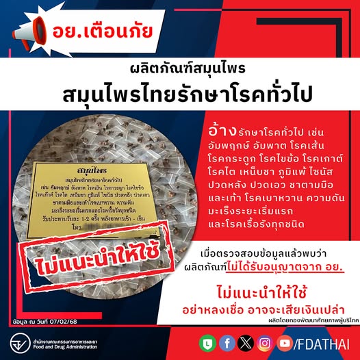 อย. แจ้งเตือนภัยผลิตภัณฑ์สมุนไพรไทยอ้างรักษาโรคทั่วไป อย่าหลงเชื่อ อาจจะเสียเงินเปล่า ข่าวสารกิจกรรม อย. แจ้งเตือนภัยผลิตภัณฑ์สมุนไพรไทยอ้างรักษาโรคทั่วไป อย่าหลงเชื่อ อาจจะเสียเงินเปล่า สำนักงานคณะกรรมการอาหารและยา แจ้งเตือนภัยผลิตภัณฑ์สมุนไพร สมุนไพรไทยรักษาโรคทั่วไป อ้างรักษาโรคทั่วไป เช่น อัมพฤกษ์ อัมพาต โรคเส้น โรคกระดูก โรคไขข้อ โรคเกาต์ โรคไต เหน็บชา ภูมิแพ้ โซนัส ปวดหลัง ปวดเอว ชาตามมือและเท้า โรคเบาหวาน ความดัน มะเร็งระยะเริ่มแรกและโรคเรื้อรังทุกชนิด จากการตรวจสอบพบว่าผลิตภัณฑ์ไม่ได้รับอนุญาตจาก อย. ไม่แนะนำให้ใช้ อย่าหลงเชื่อ อาจจะเสียเงินเปล่า ที่มา : https://citly.me/ITcBZ Post Views: 20 FacebookFacebookXTwitterLINELine