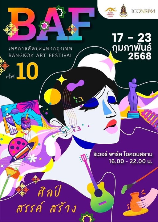 สำนักงานศิลปวัฒนธรรมร่วมสมัย กระทรวงวัฒนธรรม ร่วมกับ ไอคอนสยาม ชวนยกระดับความคิดสร้างสรรค์ ขับเคลื่อนเศรษฐกิจด้วยวัฒนธรรม โดยการกลับมาอีกครั้งกับเทศกาลทางศิลปวัฒนธรรมร่วมสมัยที่รวบรวมเอาผลงานสร้างสรรค์ งานฝีมือของร้านดังมาจัดแสดงใหัทุกคนได้เดิน ชม ช็อป ชิล ในบรรยากาศยามเย็นริมแม่น้ำเจ้าพระยา ณ ริเวอร์ พาร์ค ชั้น G ไอคอนสยาม ในเทศกาลศิลปะแห่งกรุงเทพ (BAF) ครั้งที่ 10 ระหว่างวันที่ 17 – 23 กุมภาพันธ์ 2568 เวลา 16.00 – 22.00 น. ภายในงานประกอบด้วย กิจกรรมการสาธิตงานศิลปะร่วมสมัย (Workshop) การแสดงคณะนักแสดง/ดนตรีร่วมสมัย และเที่ยวชม เลือกซื้อผลิตภัณฑ์และผลงานศิลปะจากร้านค้าเครือข่ายมากมาย