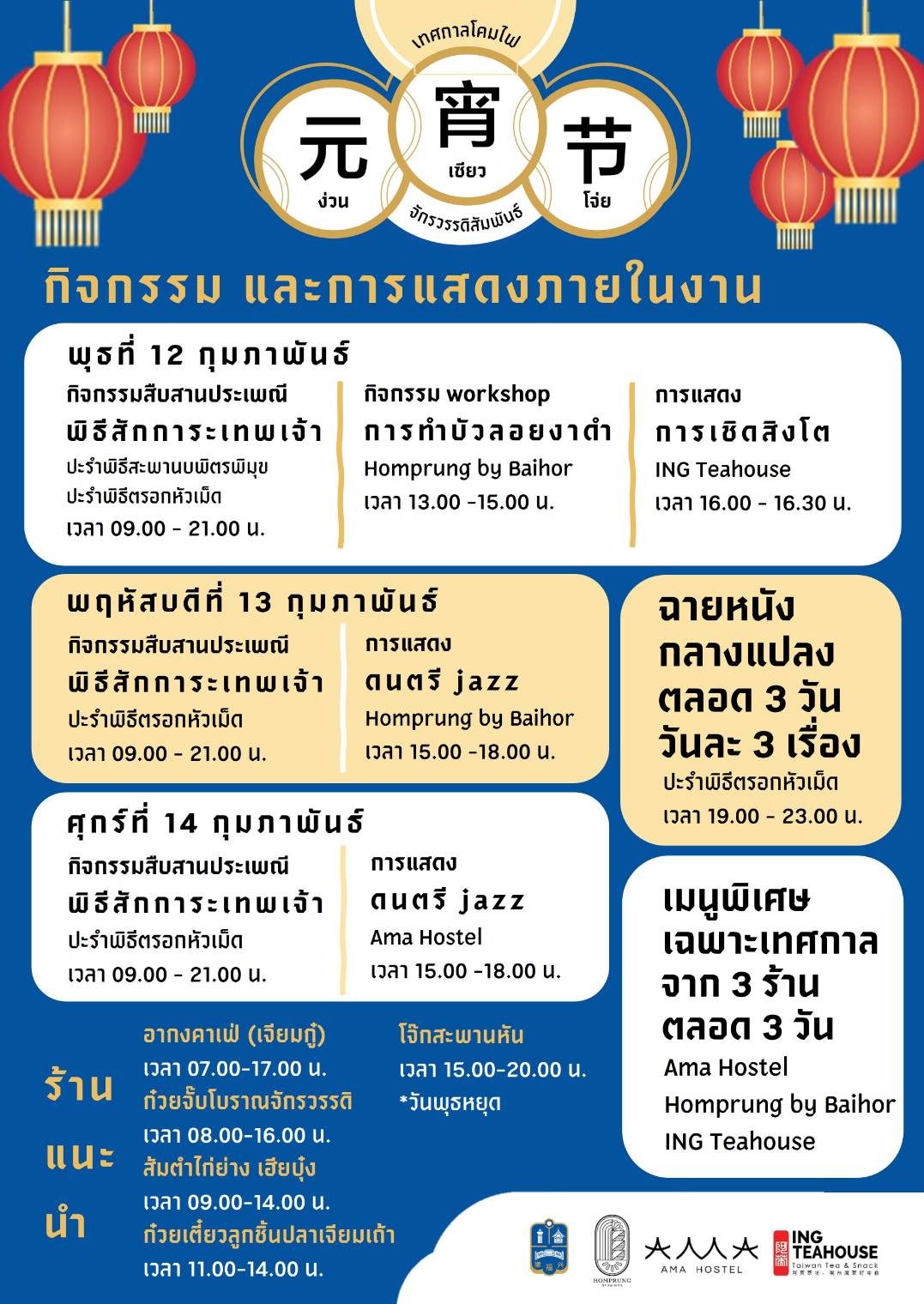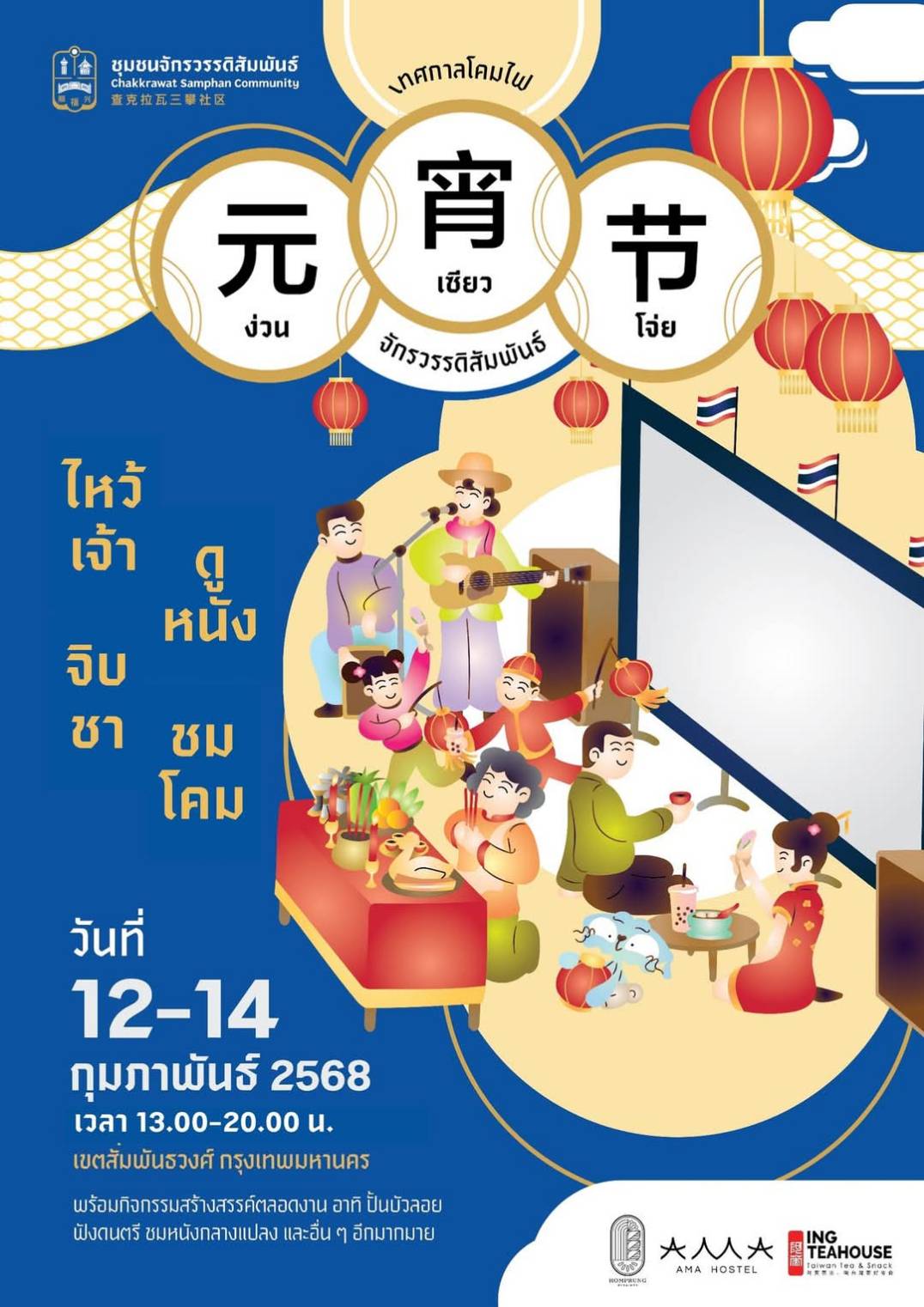 กรุงเทพมหานคร ชวนเที่ยวงาน “ง่วน เซียว โจ่ย เทศกาลโคมไฟจักรวรรดิสัมพันธ์” ข่าวสารกิจกรรม กรุงเทพมหานคร ชวนเที่ยวงาน “ง่วน เซียว โจ่ย เทศกาลโคมไฟจักรวรรดิสัมพันธ์” กรุงเทพมหานคร ชวนเที่ยวงาน “ง่วน เซียว โจ่ย เทศกาลโคมไฟจักรวรรดิสัมพันธ์” และพบกับ พิธีไหว้สักการะเทพเจ้าแบบเเต้จิ๋ว การฉายหนังกลางแปลง สาธิตการทำบัวลอยงาดำ และเมนูพิเศษของร้านค้าในชุมชน วันที่ 12 – 14 กุมภาพันธ์ 2568 เวลา 13.00 – 20.00 น. ณ ชุมชนจักรวรรดิสัมพันธ์ ที่มา : https://shorturl.asia/0GY5k Post Views: 87 FacebookFacebookXTwitterLINELine