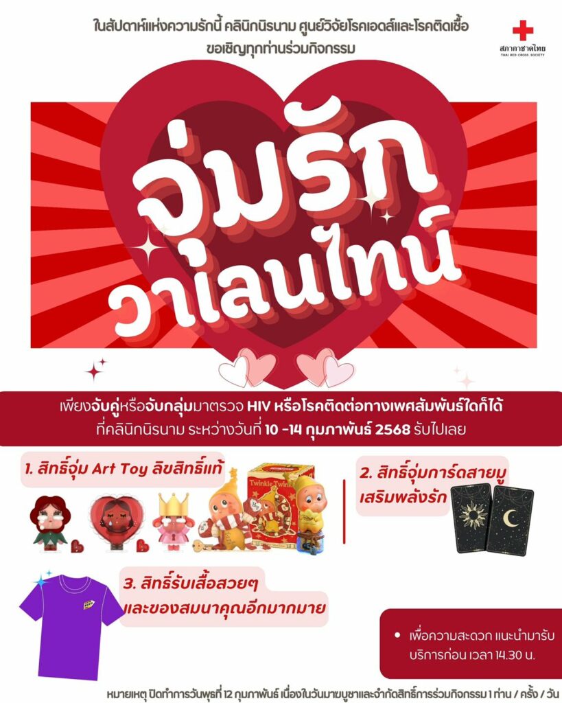 คลินิกนิรนาม ศูนย์วิจัยโรคเอดส์และโรคติดเชื้อ สภากาชาดไทย ชวนทุกท่านร่วมกิจกรรม จุ่มรัก #วาเลนไทน์ เพียงจับคู่หรือจับกลุ่มมาตรวจ HIV หรือโรคติดต่อทางเพศสัมพันธ์ ใดก็ได้ระหว่างวันที่ 10 -14 กุมภาพันธ์ 2568 ณ คลินิกนิรนาม