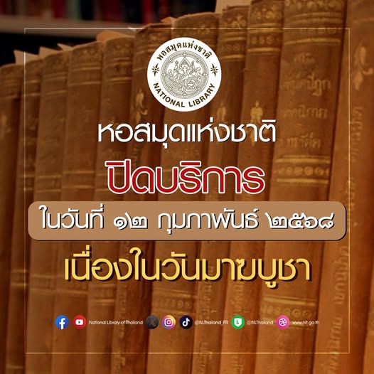 หอสมุดแห่งชาติ แจ้งปิดบริการในวันที่ 12 กุมภาพันธ์ 2568 ข่าวสารกิจกรรม หอสมุดแห่งชาติ แจ้งปิดบริการในวันที่ 12 กุมภาพันธ์ 2568 หอสมุดแห่งชาติ แจ้งปิดบริการ ในวันที่ 12 กุมภาพันธ์ 2568 เนื่องในวันมาฆบูชา ที่มา : https://citly.me/HgFJ6 Post Views: 10 FacebookFacebookXTwitterLINELine
