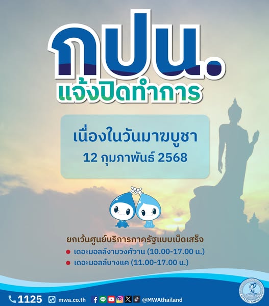 กปน. แจ้งปิดทำการ วันที่ 12 กุมภาพันธ์ 2568 เนื่องในวันมาฆบูชา ข่าวสารกิจกรรม กปน. แจ้งปิดทำการ วันที่ 12 กุมภาพันธ์ 2568 เนื่องในวันมาฆบูชา การประปานครหลวง แจ้งปิดทำการ วันที่ 12 กุมภาพันธ์ 2568 เนื่องในวันมาฆบูชา ลูกค้าสามารถใช้บริการได้ที่ ศูนย์บริการภาครัฐเบ็ดเสร็จ เดอะมอลล์งามวงศ์วาน ตั้งแต่เวลา 10.00 – 17.00 น. และ จุดบริการด่วนมหานคร เดอะมอลล์บางแค ตั้งแต่เวลา 11.00 – 17.00 น. หรือ ผ่านช่องทางออนไลน์ได้ทางแอปพลิเคชัน MWA onMobile สอบถามข้อมูลเพิ่มเติมได้ที่ MWA call center โทร. 1125 หรือ line: @MWAthailand ตลอด 24 ชั่วโมง ที่มา : https://citly.me/AYjQm Post Views: 8 FacebookFacebookXTwitterLINELine