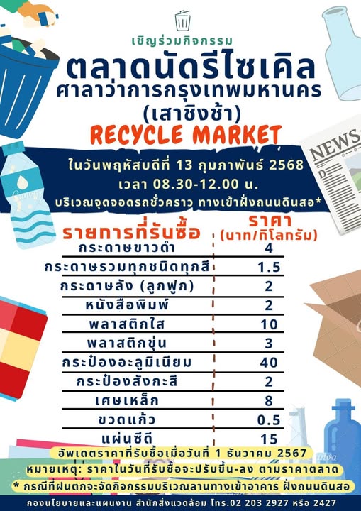 - สำนักสิ่งแวดล้อม ขอเชิญชวน นำขยะรีไซเคิลมาเปลี่ยนเป็นเงินในตลาดนัดรีไซเคิลกทม.(เสาชิงช้า)