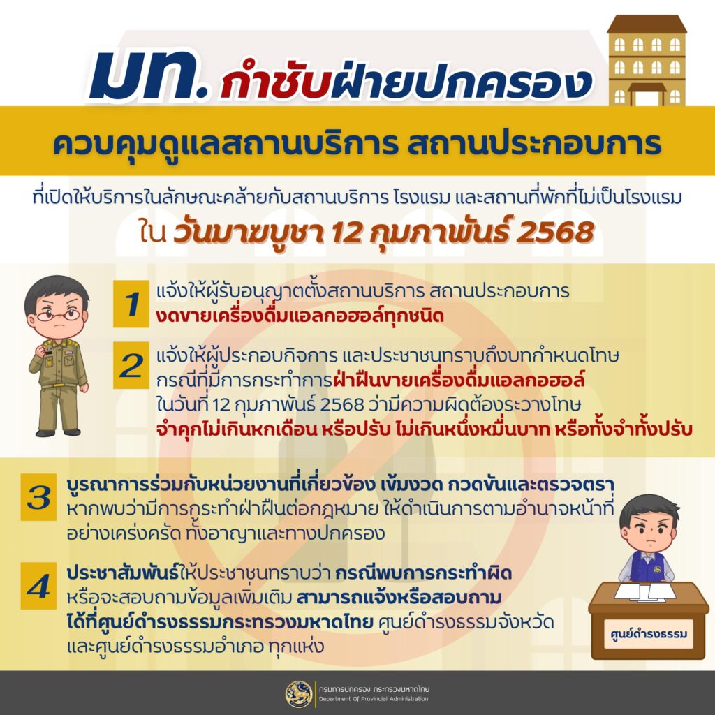 กระทรวงมหาดไทย กำชับฝ่ายปกครองควบคุมดูแลสถานบริการ สถานประกอบการ ที่เปิดให้บริการในลักษณะคล้ายกับสถานบริการ โรงแรม และสถานที่พักที่ไม่เป็นโรงแรม ในวันมาฆบูชา พ.ศ. 2568