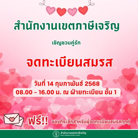 สำนักงานเขตภาษีเจริญ เชิญชวนคู่รักจดทะเบียนสมรส วันที่ 14 กุมภาพันธ์ 2568 รับฟรีของที่ระลึก ข่าวสารกิจกรรม สำนักงานเขตภาษีเจริญ เชิญชวนคู่รักจดทะเบียนสมรส วันที่ 14 กุมภาพันธ์ 2568 รับฟรีของที่ระลึก สำนักงานเขตภาษีเจริญ เชิญชวนคู่รักจดทะเบียนสมรส ในวันแห่งความรัก วันที่ 14 กุมภาพันธ์ 2568 ณ ฝ่ายทะเบียน ชั้น 1 สำนักงานเขตภาษีเจริญ รับฟรี ของที่ระลึกของที่ระลึกให้กับผู้จดทะเบียนสมรสทุกคู่ สอบถามรายละเอียดเพิ่มเติมได้ที่ ฝ่ายทะเบียน โทร. 0 2413 0568 ต่อ 6612 ที่มา : https://citly.me/nW163 Post Views: 77 FacebookFacebookXTwitterLINELine
