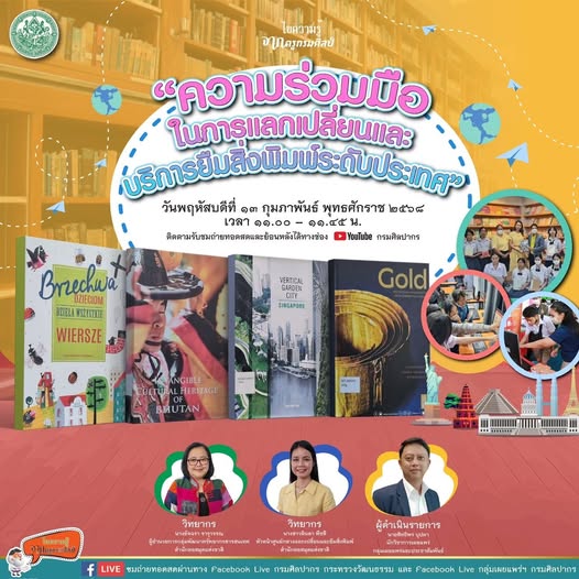 กรมศิลปากร ขอเชิญรับชมถ่ายทอดสด Facebook Live รายการไขความรู้จากครูกรมศิลป์ ตอน “ความร่วมมือในการแลกเปลี่ยนและบริการยืมสิ่งพิมพ์ระดับประเทศ” ในวันที่ 13 กุมภาพันธ์ 2568 เวลา 11.00 – 11.45 น. สามารถติดตามชมได้ทาง Facebook Live : กรมศิลปากร กระทรวงวัฒนธรรม และ Facebook Live : กลุ่มเผยแพร่ฯ กรมศิลปากร