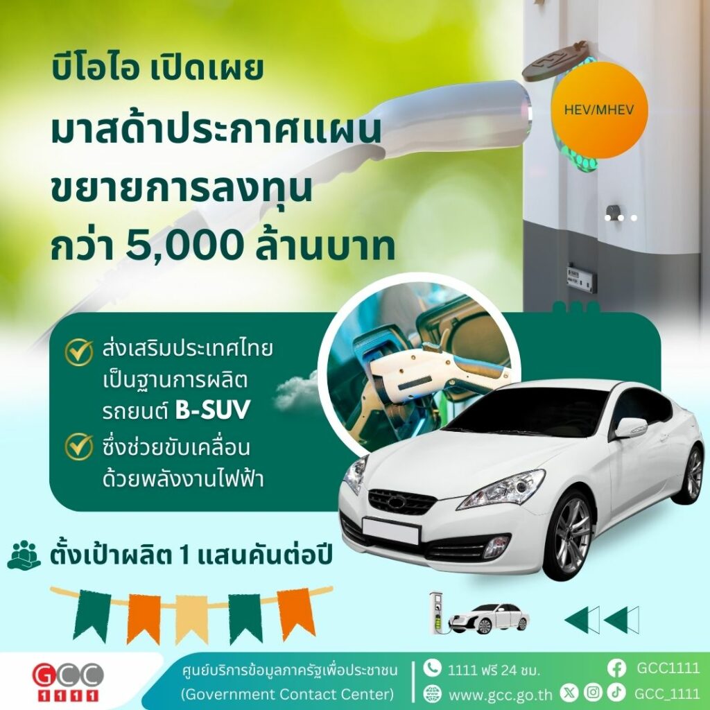 บีโอไอ เผยมาสด้า เข้าพบนายกรัฐมนตรี แพทองธาร ชินวัตร พร้อมประกาศแผนลงทุนกว่า 5,000 ล้านบาท ตามมาตรการส่งเสริม HEV/MHEV ที่บอร์ดอีวีเห็นชอบ หนุนไทยฐานผลิตรถยนต์ B-SUV ซึ่งช่วยขับเคลื่อนด้วยพลังงานไฟฟ้า ตั้งเป้าผลิต 1 แสนคันต่อปี ย้ำศักยภาพประเทศไทยเป็นผู้นำฐานผลิตและส่งออกยานยนต์แห่งอนาคตทุกเซกเมนต์ของภูมิภาค