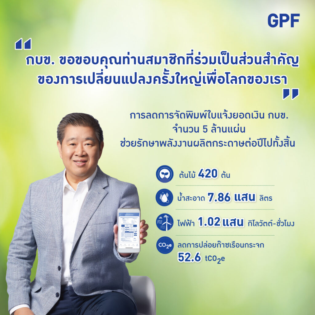 “กบข. ขอขอบคุณสมาชิกทุกท่านที่ร่วมเป็นส่วนหนึ่งในการรักษ์โลกผ่านการเปลี่ยนมาใช้ e-Statement ช่วยลดการใช้ทรัพยากรธรรมชาติและมีส่วนช่วยสร้างอนาคตที่ยั่งยืนให้กับสิ่งแวดล้อมไปด้วยกัน” นายทรงพล กล่าว