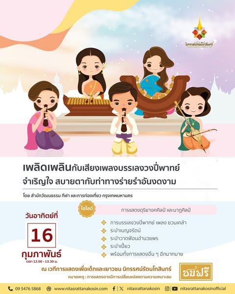 นิทรรศน์รัตนโกสินทร์ จัดเวทีการแสดงเพื่อเด็กและเยาวชน วันอาทิตย์ที่ 16 กุมภาพันธ์ 2568 เพลิดเพลินกับเสียงเพลงบรรเลงวงปี่พาทย์ จำเริญใจ สบายตากับท่าทางร่ายรำอันงดงาม โดย สำนักวัฒนธรรม กีฬา และการท่องเที่ยว กรุงเทพมหานคร