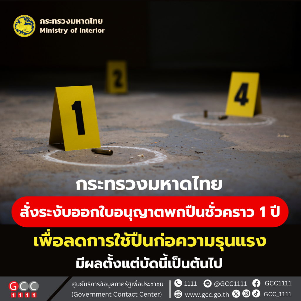 มท. สั่งระงับออกใบอนุญาตพกปืนชั่วคราว 1 ปี ลดการใช้ปืนก่อความรุนแรง เริ่มวันที่ 14 ก.พ. 68
