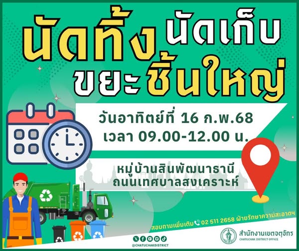 สำนักงานเขตจตุจักร นัดทิ้ง นัดเก็บ ขยะชิ้นใหญ่ วันอาทิตย์ที่ 16 กุมภาพันธ์ 2568 ข่าวสารกิจกรรม สำนักงานเขตจตุจักร นัดทิ้ง นัดเก็บ ขยะชิ้นใหญ่ วันอาทิตย์ที่ 16 กุมภาพันธ์ 2568 สำนักงานเขตจตุจักร นัดทิ้ง นัดเก็บ ขยะชิ้นใหญ่ วันอาทิตย์ที่ 16 กุมภาพันธ์ 2568 ณ หมู่บ้านสินพัฒนาธานี ถนนเทศบาลสงเคราะห์ เวลา 09.00 – 12.00 น. สอบถามเพิ่มเติมที่ ฝ่ายรักษาความสะอาดฯ โทร.0 2511 2658 ที่มา : https://citly.me/TyOgb Post Views: 37 FacebookFacebookXTwitterLINELine