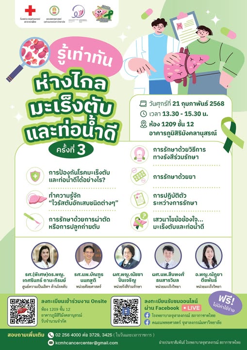- ศูนย์ความเป็นเลิศทางการแพทย์โรคมะเร็งครบวงจรฯ ขอเชิญร่วมงานรู้เท่าทัน ห่างไกลมะเร็งตับและท่อน้ำดี ครั้งที่ 3