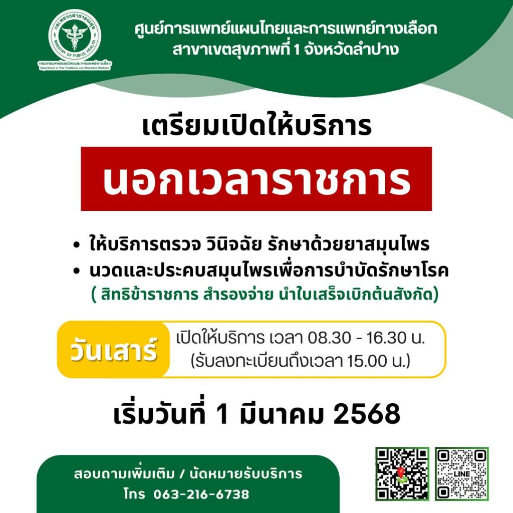ศูนย์การแพทย์แผนไทยและการแพทย์ทางเลือก สาขาเขตสุขภาพที่ 1 จังหวัดลำปาง เตรียมเปิดให้บริการนอกเวลาราชการ ทุกวันเสาร์ เวลา 08.30-16.30 น. (รับลงทะเบียนถึงเวลา 15.00 น.) เริ่มวันที่ 1 มีนาคม 2568