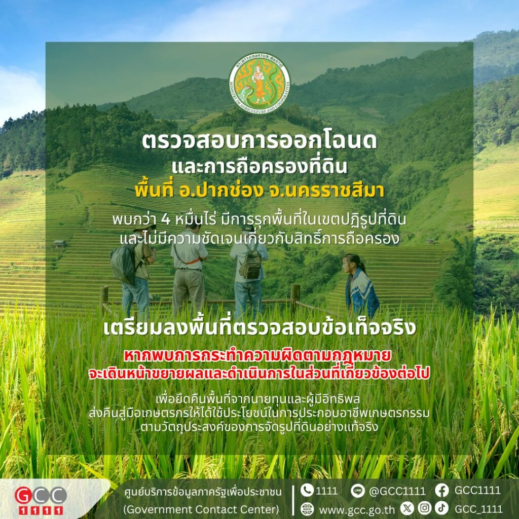 กระทรวงเกษตรและสหกรณ์ เปิดเผยข้อมูลการตรวจสอบการออกโฉนดและการถือครองที่ดินในพื้นที่อำเภอปากช่อง จังหวัดนครราชสีมา พบว่าพื้นที่กว่า 4 หมื่นไร่ มีการรุกพื้นที่ในเขตปฏิรูปที่ดินและไม่มีความชัดเจนเกี่ยวกับสิทธิ์การถือครอง จึงเตรียมลงพื้นที่พร้อมกับหน่วยงานที่เกี่ยวข้องเพื่อตรวจสอบข้อเท็จจริงในพื้นที่ดังกล่าว หากพบการกระทำความผิดตามกฎหมายจริง จะเดินหน้าขยายผลและดำเนินการในส่วนที่เกี่ยวข้องต่อไป ทั้งนี้ เพื่อยึดคืนพื้นที่จากนายทุนและผู้มีอิทธิพล ส่งคืนสู่มือเกษตรกรให้ได้ใช้ประโยชน์ในการประกอบอาชีพเกษตรกรรมตามวัตถุประสงค์ของการจัดรูปที่ดินอย่างแท้จริง
