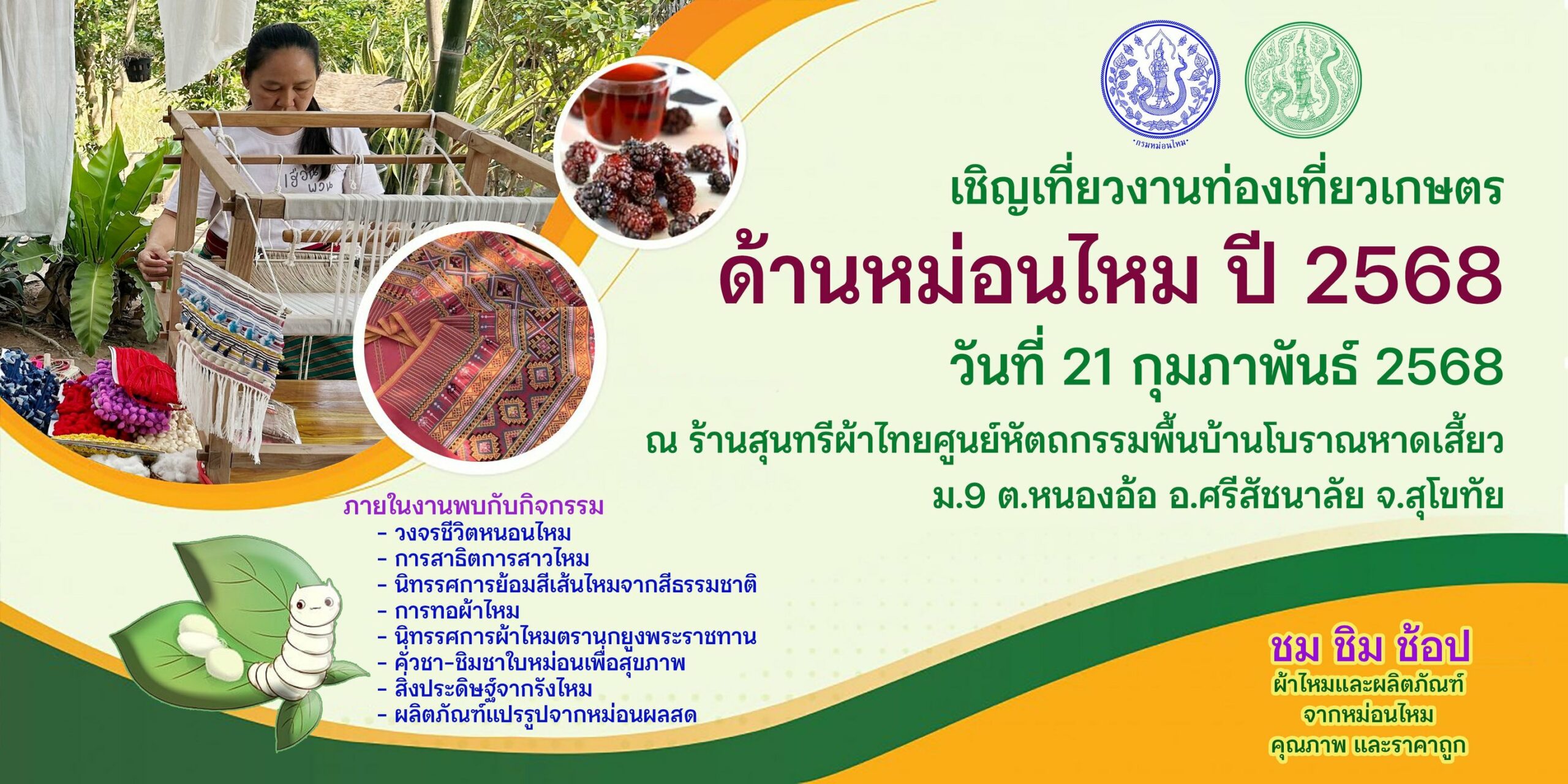 กรมหม่อนไหม เชิญชวนร่วมงานท่องเที่ยวเกษตรด้านหม่อนไหม ปี 2568 และ ชม ชิม ช้อป ผ้าไหมและผลิตภัณฑ์จากหม่อนไหม คุณภาพ และราคาถูก วันที่ 21 กุมภาพันธ์ 2568 ณ ร้านสุนทรีผ้าไทย ศูนย์หัตถกรรมพื้นบ้านโบราณหาดเสี้ยว หมู่ที่ 9 ตำบลหนองอ้อ อำเภอศรีสัชนาลัย จังหวัดสุโขทัย