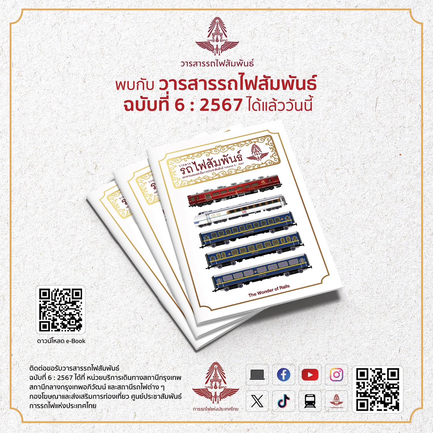 การรถไฟแห่งประเทศไทย แนะนำ วารสารรถไฟสัมพันธ์ ฉบับที่ 6 : 2567 ได้แล้ววันนี้ โดยเชิญชวนท่านเปิดประสบการณ์ท่องเที่ยวทางรถไฟผ่านขบวนรถโดยสารพิเศษ สำหรับให้บริการเช่าเหมาตู้หรือเหมาขบวนของการรถไฟแห่งประเทศไทย พร้อมตอบสนองความต้องการทุกระดับ ไม่ว่าจุดหมายปลายทางของท่านจะเป็นที่ใด ให้ระหว่างทางของท่าน มีความหมายในแบบที่ไม่เคยสัมผัสมาก่อน ผู้ที่สนใจสามารถอ่านแบบ E-book เล่ม 6:2567 แบบออนไลน์ได้ที่ https://online.fliphtml5.com/ctvfc/beio/#p=1 หรือดาวน์โหลดไฟล์ PDF ได้ที่ https://shorturl.asia/maLlE ติดต่อขอรับวารสารรถไฟสัมพันธ์ได้ที่ หน่วยบริการเดินทางสถานีกรุงเทพ และสถานีรถไฟทั่วประเทศ, ศูนย์ประชาสัมพันธ์ การรถไฟฯ