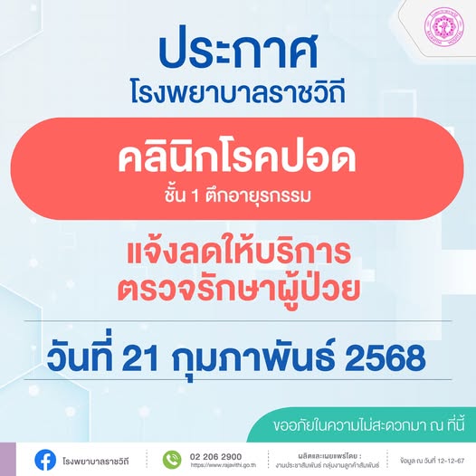 โรงพยาบาลราชวิถี กรมการแพทย์ แจ้ง “คลินิกโรคปอด” ลดให้บริการตรวจรักษาผู้ป่วย 21 ก.พ. 68 ข่าวสารกิจกรรม โรงพยาบาลราชวิถี กรมการแพทย์ แจ้ง “คลินิกโรคปอด” ลดให้บริการตรวจรักษาผู้ป่วย 21 ก.พ. 68 โรงพยาบาลราชวิถี กรมการแพทย์ แจ้ง “คลินิกโรคปอด” ชั้น 1 ตึกอายุรกรรม ลดให้บริการตรวจรักษาผู้ป่วย วันที่ 21 กุมภาพันธ์ 2568 ที่มา : https://citly.me/LGHBv Post Views: 20 FacebookFacebookXTwitterLINELine