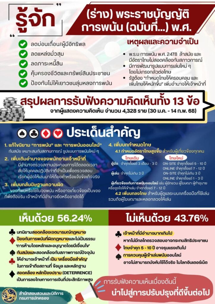 ทั้งนี้ พร้อมดำเนินการปราบปรามอย่างเข้มข้น นายอนุทิน ได้สั่งการให้แก้ให้ พ.ร.บ. การพนัน พ.ศ. 2478 ให้สามารถบังคับใช้สอดคล้องกับสภาวการณ์ปัจจุบัน ทั้งต้องครอบคลุมบ่อนพนัน พนันออนไลน์ การปฏิบัติการของเจ้าหน้าที่ที่มีประสิทธิภาพ ตลอดจนอัตราโทษที่หนักขึ้น ซึ่งกรมการปกครอง โดยสำนักการสอบสวนและนิติการ ได้ยกร่างพระราชบัญญัติการพนัน (ฉบับที่ …) พ.ศ. … และได้ดำเนินการรับฟังความคิดเห็นของพี่น้องประชาชนและผู้เกี่ยวข้อง (Public Hearing) ตั้งแต่วันที่ 30 ม.ค. – 14 ก.พ. 68