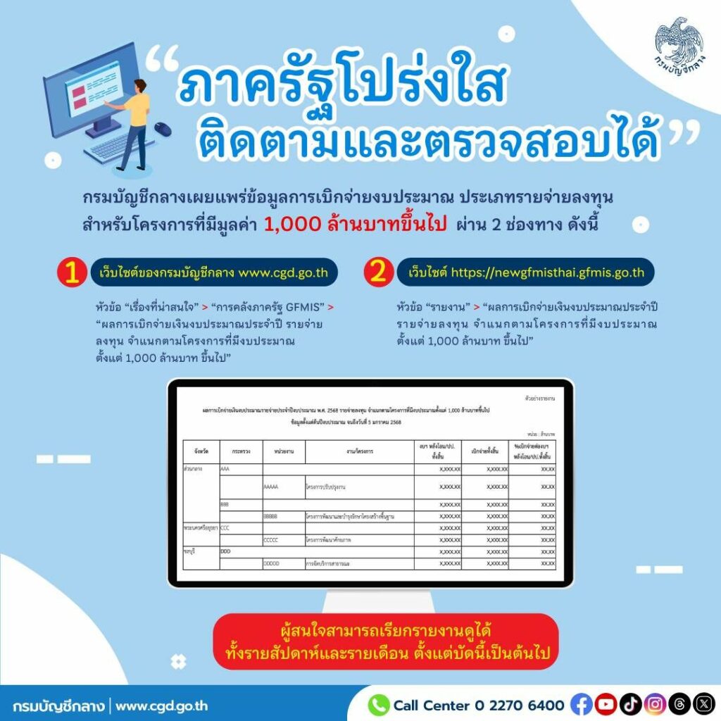 กรมบัญชีกลาง เผยแพร่ข้อมูลการเบิกจ่ายงบประมาณ ประเภทรายจ่ายลงทุน “ตั้งแต่ 1,000 ล้านบาท ขึ้นไป”