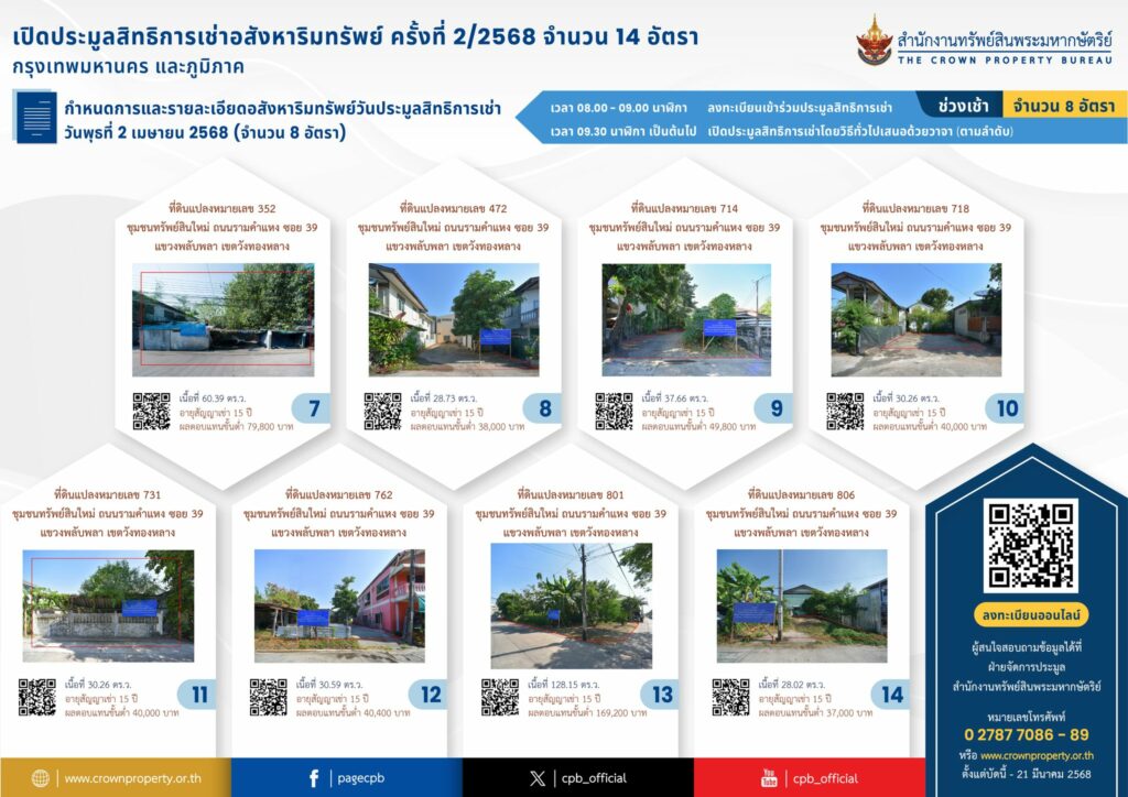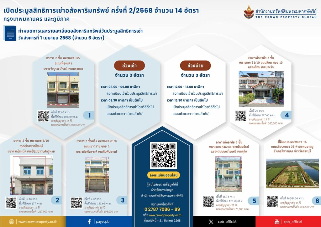 สำนักงานทรัพย์สินพระมหากษัตริย์ ข้อมูลพื้นที่เปิดประมูลสิทธิการเช่าอสังหาริมทรัพย์ ครั้งที่ 2/2568 จำนวน 14 อัตรา กรุงเทพมหานคร และภูมิภาค ลงทะเบียนออนไลน์ https://forms.gle/7ht2tcragkWdKRk5A   ตั้งแต่บัดนี้ – 21 มีนาคม 2568 สอบถามข้อมูลได้ที่ โทร. 0 2787 7086 – 89 เว็บไซต์ https://bit.ly/4k15ZBY