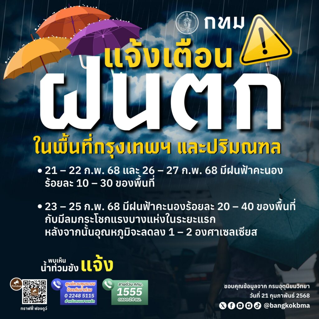 กรุงเทพมหานคร แจ้งเตือน ฝนตกในพื้นที่กรุงเทพฯ และปริมณฑล วันที่ 21 – 27 ก.พ. 68