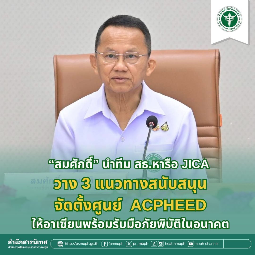รัฐมนตรีว่าการกระทรวงสาธารณสุขนำทีมผู้บริหารหารือผู้เชี่ยวชาญ JICA วางแผนเดินหน้าจัดตั้งศูนย์ ACPHEED ผ่าน 3 กิจกรรม เตรียมแลกเปลี่ยนเรียนรู้กับศูนย์ป้องกันและควบคุมโรคยุโรป มาประยุกต์วางโครงสร้างการทำงานของศูนย์ ACPHEED จัดทำหลักสูตรพัฒนาบุคลากรสาธารณสุขอาเซียน และบูรณาการข้อมูลสารสนเทศให้อาเซียนพร้อมรับมือภัยพิบัติในอนาคต