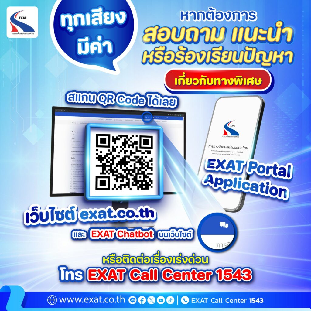 - เว็บไซต์ exat.co.th – ส่งข้อเสนอแนะและสอบถามข้อมูลผ่านเว็บได้สะดวก