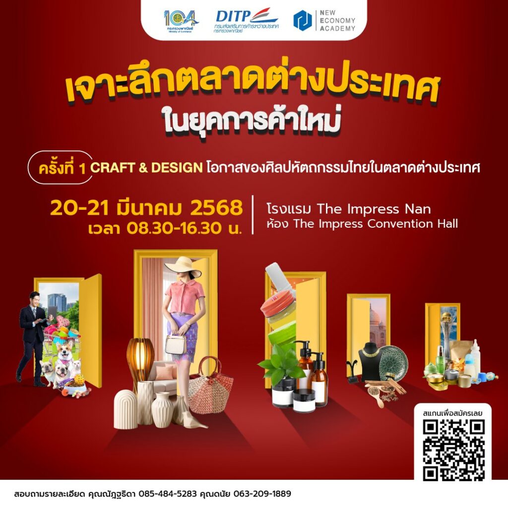 กรมส่งเสริมการค้าระหว่างประเทศ โดยสถาบันพัฒนาผู้ประกอบการการค้ายุคใหม่ ขอเชิญสมัครเข้าร่วม โครงการ “เจาะลึกตลาดต่างประเทศในยุคการค้าใหม่“ ครั้งที่ 1 : Craft & Design โอกาสของศิลปหัตถกรรมไทยในตลาดต่างประเทศ โดยจัดอบรมในรูปแบบ Onsite @ The Impress Nan, Conventional Hall จังหวัดน่าน ดินแดนแห่งศิลปหัตถกรรมไทย วันที่ 20 – 21 มีนาคม 2568 เวลา 08.30 – 16.30 น.