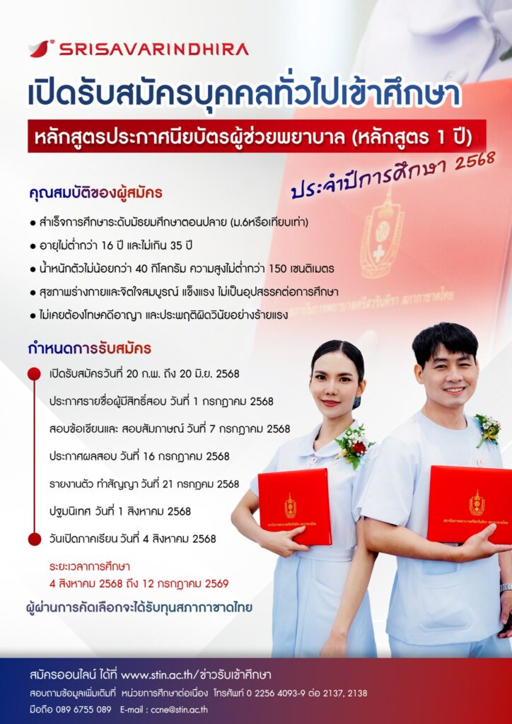 สถาบันการพยาบาลศรีสวรินทิรา สภากาชาดไทย เปิดรับสมัครผู้เข้าศึกษา หลักสูตรผู้ช่วยพยาบาล ประจำปี 2568