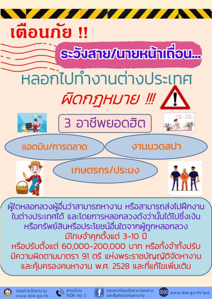 กรมการจัดหางาน เตือนภัยระวังสาย/นายหน้าเถื่อน หลอกไปทำงานต่างประเทศผิดกฎหมาย