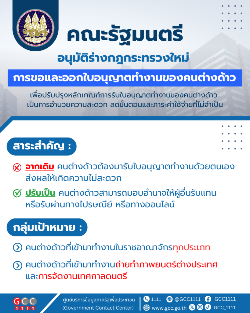 - กระทรวงแรงงานจึงได้เสนอร่างกฎกระทรวงการขออนุญาตทำงาน การออกใบอนุญาตทำงาน และการแจ้งการทำงานของคนต่างด้าว (ฉบับที่ ..) พ.ศ. …. เพื่อแก้ไขกฎกระทรวงดังกล่าวโดยปรับปรุงวิธีการรับใบอนุญาตทำงานของคนต่างด้าวที่เข้ามาทำงานในราชอาณาจักรทุกประเภท รวมถึงคนต่างด้าวที่เข้ามาทำงานเกี่ยวกับการถ่ายทำภาพยนตร์ต่างประเทศ และการจัดงานเทศกาลดนตรี โดยมีสาระสำคัญเป็นการยกเลิกการรับใบอนุญาตทำงานของคนต่างด้าวจากที่กำหนดให้คนต่างด้าวต้องเดินทางมารับใบอนุญาตทำงานด้วยตนเองเท่านั้น และกรมการจัดหางานจะกำหนดวิธีการให้คนต่างด้าวสามารถรับใบอนุญาตทำงานได้ เช่น ให้คนต่างด้าวสามารถมอบอำนาจให้ผู้อื่นรับแทน รับผ่านทางไปรษณีย์หรือทางออนไลน์ เพื่อให้เกิดความยืดหยุ่นและลดข้อจำกัดของการดำเนินการดังกล่าว ตลอดจนเพื่ออำนวยความสะดวกให้แก่คนต่างด้าวและผู้ประกอบการให้คนต่างด้าวสามารถดำเนินการรับใบอนุญาตทำงานด้วยวิธีการที่สะดวกยิ่งขึ้น