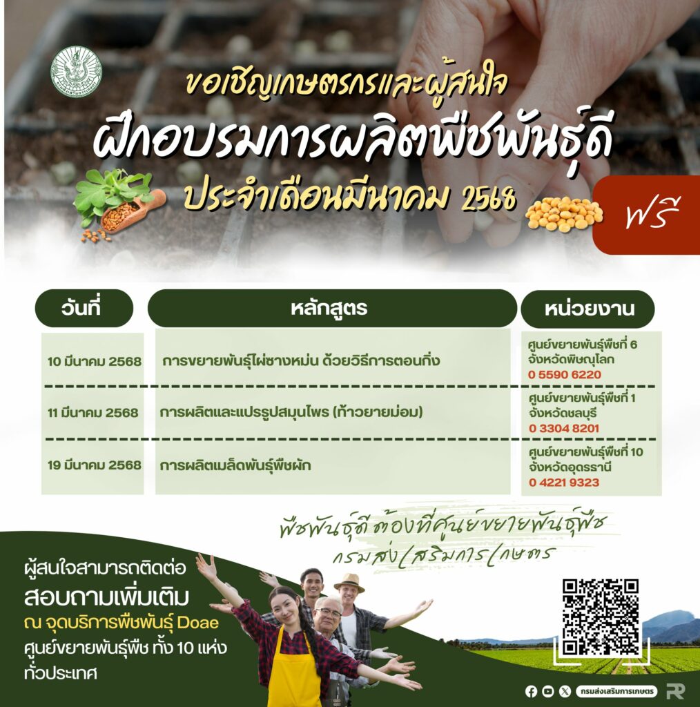 กรมส่งเสริมการเกษตร ขอเชิญเกษตรกรและผู้สนใจฝึกอบรมการผลิตพืชพันธุ์ดี ประจำเดือนมีนาคม 2568 ข่าวสารกิจกรรม กรมส่งเสริมการเกษตร ขอเชิญเกษตรกรและผู้สนใจฝึกอบรมการผลิตพืชพันธุ์ดี ประจำเดือนมีนาคม 2568 กรมส่งเสริมการเกษตร ขอเชิญเกษตรกรและผู้สนใจฝึกอบรมการผลิตพืชพันธุ์ดี ประจำเดือนมีนาคม 2568 สอบถามเพิ่มเติม ณ จุดบริการพืชพันธุ์ Doae ศูนย์ขยายพันธุ์พืช ทั้ง 10 แห่ง ทั่วประเทศ ที่มา : https://citly.me/6dzW2 Post Views: 58 FacebookFacebookXTwitterLINELine