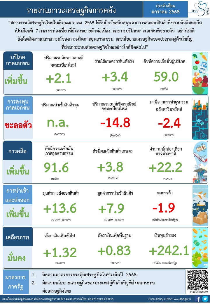 “สถานการณ์เศรษฐกิจไทยในเดือนมกราคม 2568 ได้รับปัจจัยสนับสนุนจากการส่งออกสินค้าที่ขยายตัวติดต่อกันเป็นเดือนที่ 7 ภาคการท่องเที่ยวที่ยังคงขยายตัวต่อเนื่อง และการบริโภคภาคเอกชนที่ขยายตัว อย่างไรก็ดี ยังต้องติดตามสถานการณ์ของการผลิตภาคอุตสาหกรรม และนโยบายเศรษฐกิจของประเทศคู่ค้าสำคัญที่ส่งผลกระทบต่อเศรษฐกิจไทยอย่างใกล้ชิดต่อไป”